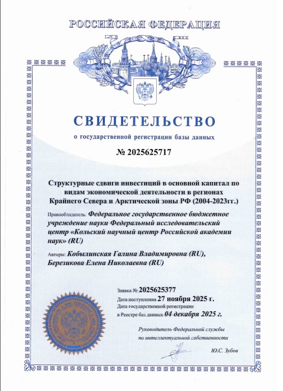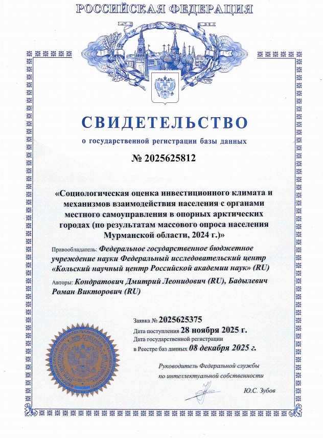 Свидетельство о государственной регистрации базы данных №2017621267 «Наиболее значимые социологические оценки социального самочувствия жителей Мурманской области за 2010, 2013, 2016 гг.» / Гущина И.А., Положенцева О.А., Кондратович Д.Л.