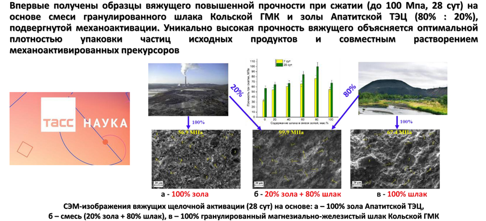 Отдельно ученый остановился на недавно прозвучавшей в СМИ новости о разработке альтернативной цементу смеси из отходов производства. Действительно, в институте впервые получили образцы вяжущего повышенной прочности из смеси гранулированного медно-никелевого шлака Кольской ГМК и золы уноса апатитской ТЭЦ. Высокая прочность объясняется оптимальной плотностью упаковки частиц исходных продуктов и совместным растворением механоактивированных прекурсоров. И, конечно, это вяжущее можно использовать при строительных работах.