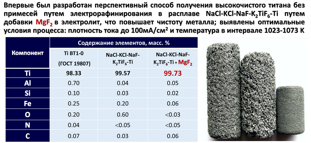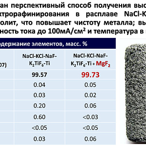 В институте впервые разработали перспективный способ получения высокочистого титана. Электрорафинирование в различных солевых расплавах путем добавки дифосфата магния в электролит чрезвычайно повышает чистоту металла, и разработка, как отметил Иван Гундарович, будет иметь большое практическое значение.