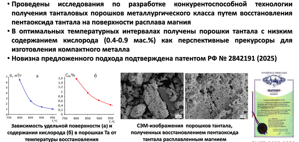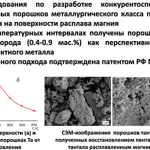 Разработана новая технология получения танталовых порошков металлургического класса – основная изюминка заключается в том, что в оптимальных условиях получаются порошки с очень низким содержанием кислорода, которые могут быть перспективными для получения компактного металла. Подход запатентован и продолжает развиваться.