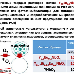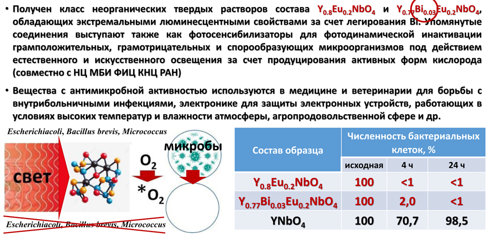 Получены неорганические твердые растворы с экстремальными люминесцентными свойствами: под действием света они продуцируют активные формы кислорода и могут применяться для фотодинамической инактивации микроорганизмов. Эти исследования выполнены совместно с Научным центром медико-биологических исследований адаптации человека в Арктике.