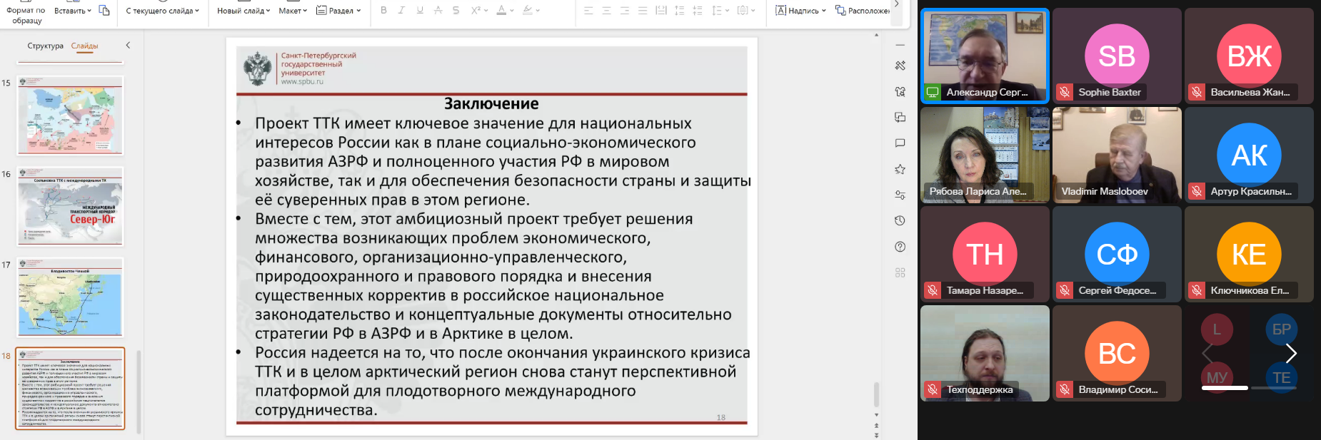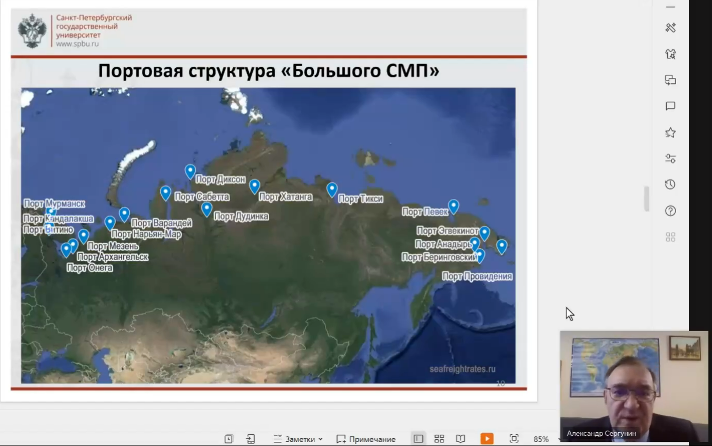 Главным экспертом сессии стал известный ученый-политолог, специализирующийся на международных отношениях и Арктике, доктор политических наук, профессор кафедры теории и истории международных отношений Санкт-Петербургского государственного университета Александр Сергунин. Он выступил с докладом «Формирование Трансарктического транспортного коридора на основе Севморпути – экономические и правовые аспекты», в котором рассказал об истории, целях и специфике проекта.