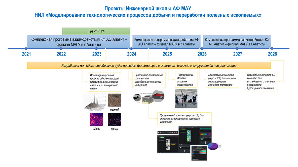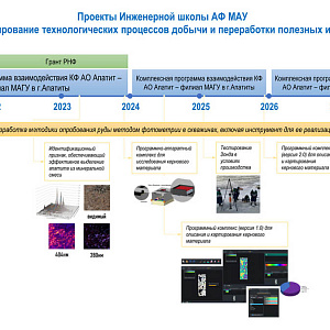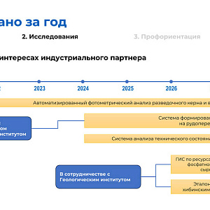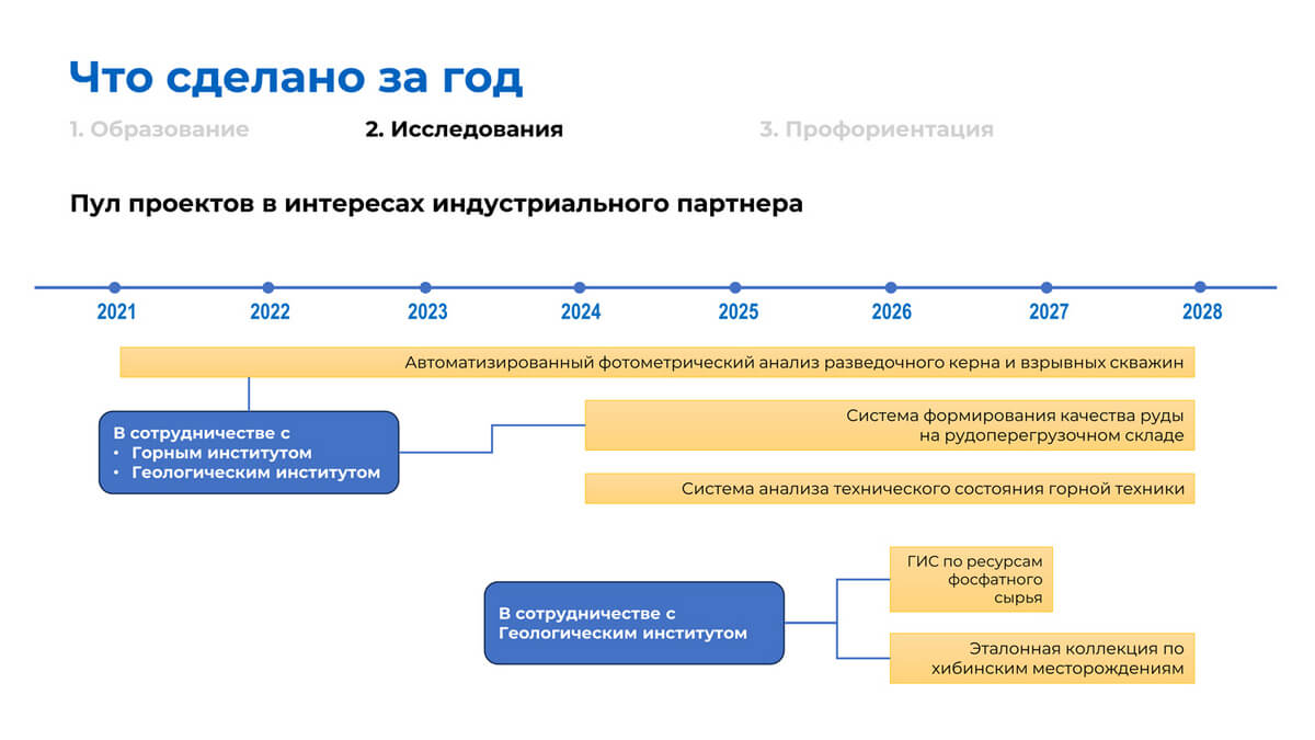 Исследовательский блок сфокусирован на решении конкретных задач промышленности. За год утверждено пять научно-исследовательских «полупроектов», которые имеют четкую прикладную направленность: от автоматизированного фотометрического анализа разведочного керна и взрывных скважин (начат еще в 2021 году совместно с Горным институтом) до системы формирования качества руды на рудоперегрузочном складе, системы анализа технического состояния горной техники, создания региональных геоинформационных систем по ресурсам фосфатного сырья и эталонной коллекции по Хибинским месторождениям. В ходе работы также создано программное обеспечение «Inventary Component» для управления командной работой и учета оборудования. Результаты исследований регулярно публикуются: за год вышли три совместные статьи с учеными Геологического института, Института химии и технологии редких элементов и минерального сырья и Института экономических проблем КНЦ РАН.