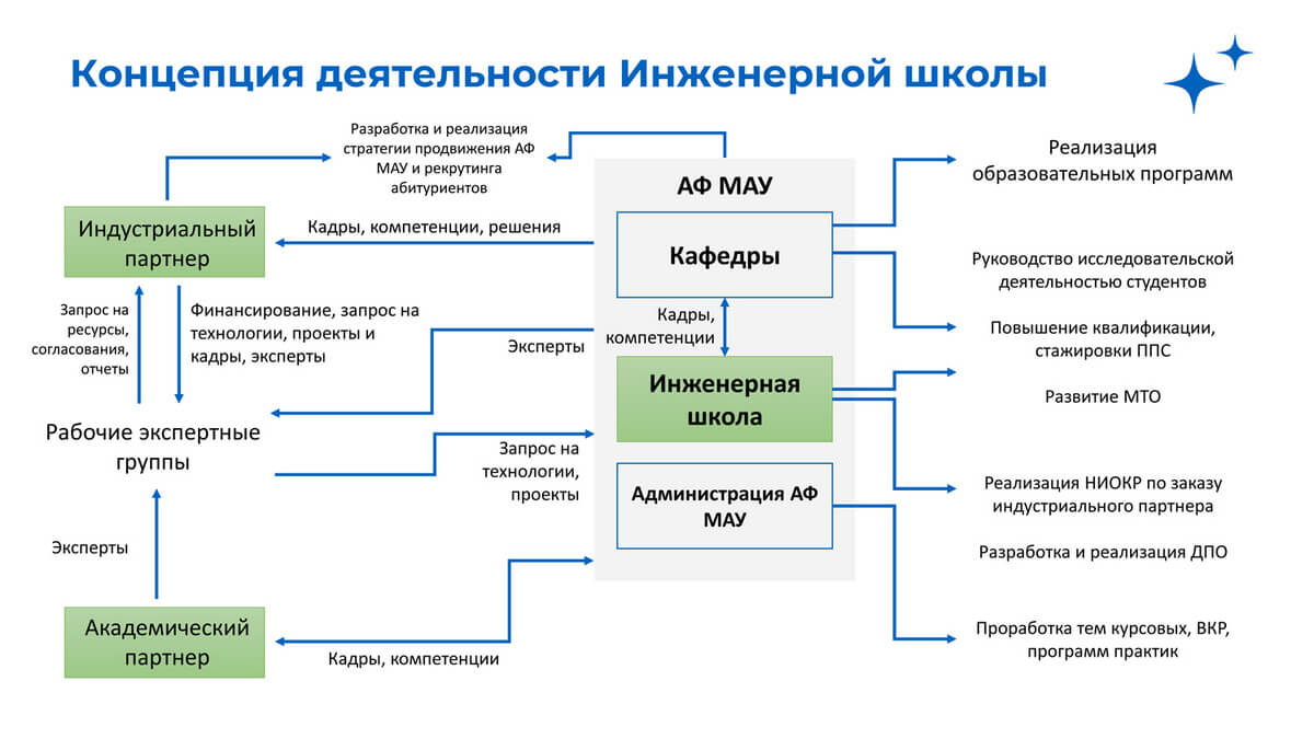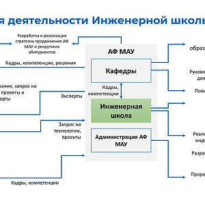За год Инженерная школа перешла от планирования к работе. Ее идеология строится на «треугольнике Лаврентьева» – интеграции высшего образования, промышленности и академической науки. Чтобы не нарушать учебные планы базовых кафедр, создали отдельную гибкую структуру, где эксперименты и прикладные задачи сочетаются с учебой, но не мешают ей. Работу ведут по трем направлениям: образовательному, исследовательскому и профориентационному.