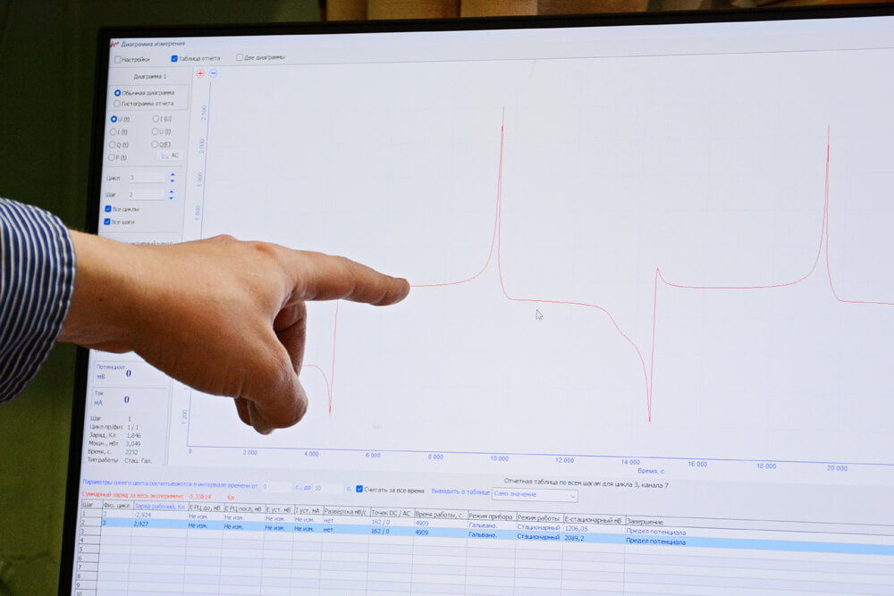 Для испытаний закуплено современное оборудование: потенциостаты-гальваностаты для циклирования и импеданс-анализаторы, показывающие, как ведет себя аккумулятор, раз за разом набирая и отдавая заряд. На графиках видно, как это происходит. В конце 2025 года в институт поступила высокотемпературная печь, способная работать в вакууме и инертной атмосфере при температурах до 1700 °C, что расширяет возможности синтеза. Скоро ее подключат, и возможностей для создания новых аккумуляторов будет еще больше.