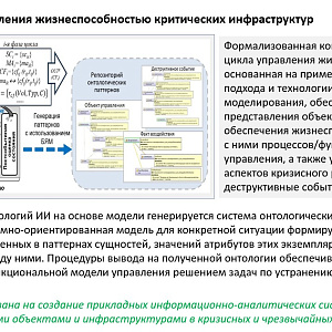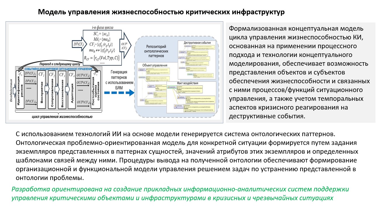 Один из результатов работы – разработка модели управления жизнеспособностью критических инфраструктур, которая впитала в себя давние наработки Института. Основное ее достоинство в ориентации на создание прикладных информационно-аналитических систем поддержки управления критическими объектами и инфраструктурами в кризисных и чрезвычайных ситуациях.