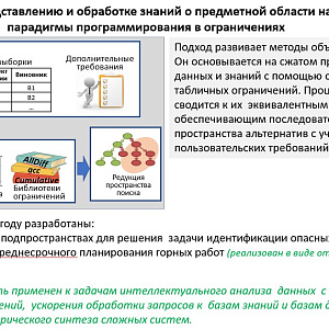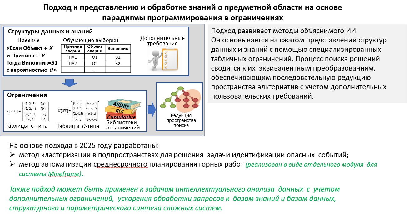 Еще одно исследование, вошедшее в первую тему госзадания, — разработка подхода к представлению и обработке знаний о предметной области на основе парадигмы программирования в ограничениях. Это позволяет решать достаточно широкий спектр задач, в том числе – большой размерности с меньшими требованиями к вычислительным ресурсам памяти. На основе подхода разработали метод кластеризации в подпространствах для решения задачи идентификации опасных событий и метод автоматизации среднесрочного планирования горных работ, реализованный в виде отдельного модуля для системы Mineframe. В 2026 году для лаборатории Mineframe сотрудники Института разрабатывают модели и программное обеспечение для оптимизации среднесрочного планирования горных работ с учетом динамических зависимостей на блоках и целевых показателей по сортам полезных ископаемых и типам пород.