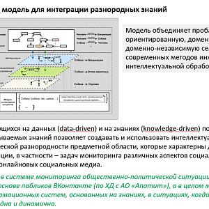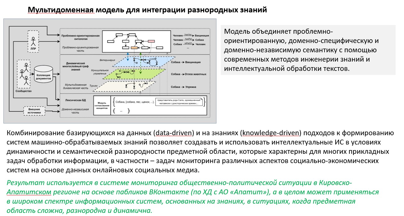 Так, была разработана мультидоменная модель для интеграции разнородных данных и знаний в зависимости от контекста, которая объединяет проблемно-ориентированную, доменно-специфическую и доменно-независимую семантику с помощью современных методов инженерии знаний и интеллектуальной обработки текстов. Результаты, полученные в этой области, используются в системе мониторинга общественно-политической ситуации в Кировско-Апатитском регионе на основе пабликов «ВКонтакте», но могут применяться и в более широком спектре информационных систем, основанных на знаниях, в ситуациях, когда предметная область сложна, разнородна и динамична.