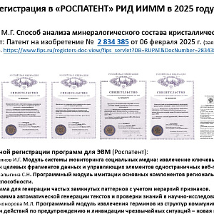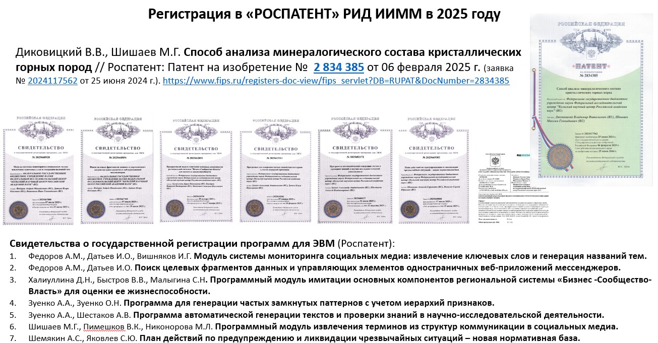 Что касается результатов интеллектуальной деятельности ИИММ, то за год в «Роспатенте» было получено семь свидетельств государственной регистрации программ для ЭВМ, а также патент на изобретение «Способ анализа минералогического состава кристаллических горных пород».