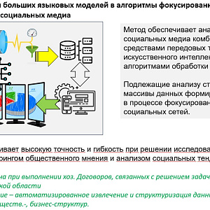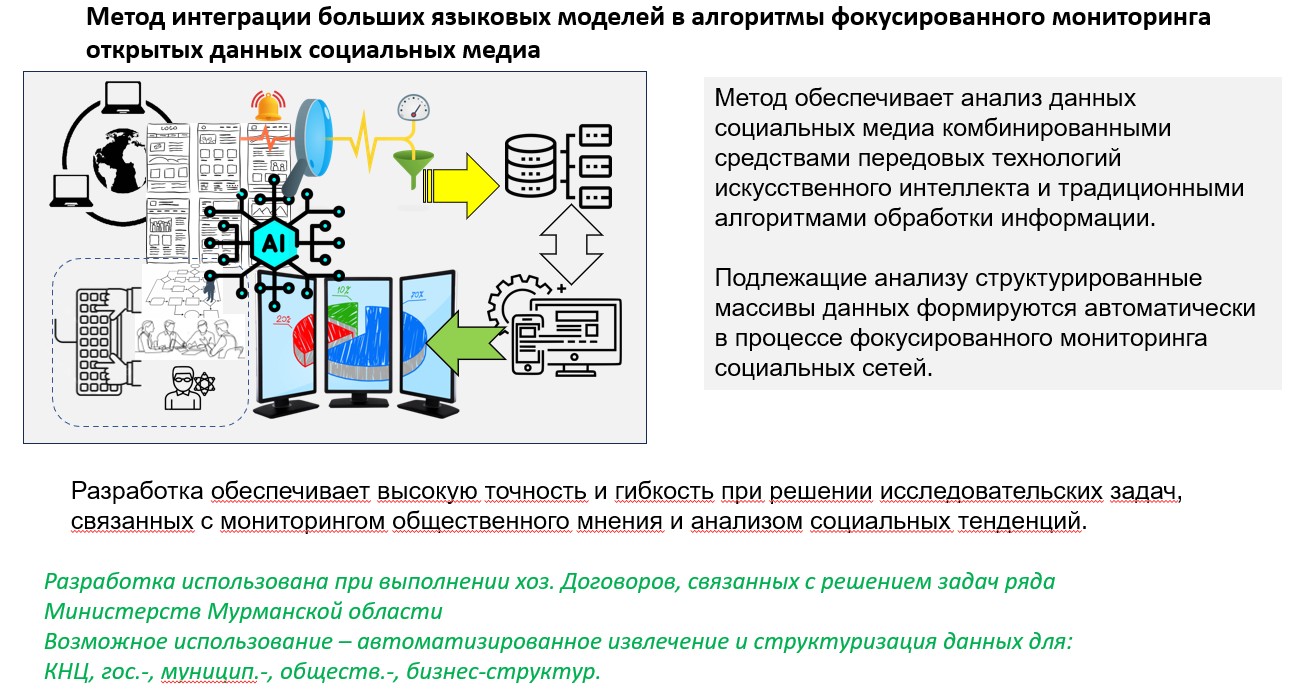 Для решения ряда задач министерств Мурманской области по хоздоговорам в институте применили комплекс методов, основанных на методе интеграции больших языковых моделей в алгоритмы фокусированного мониторинга открытых данных социальных медиа. Они позволяют анализировать огромные массивы информации, объединив технологии искусственного интеллекта и традиционные алгоритмы обработки. С их помощью можно автоматически извлекать и структурировать данные не только для государственных и муниципальных структур, но и для научных организаций или бизнеса.