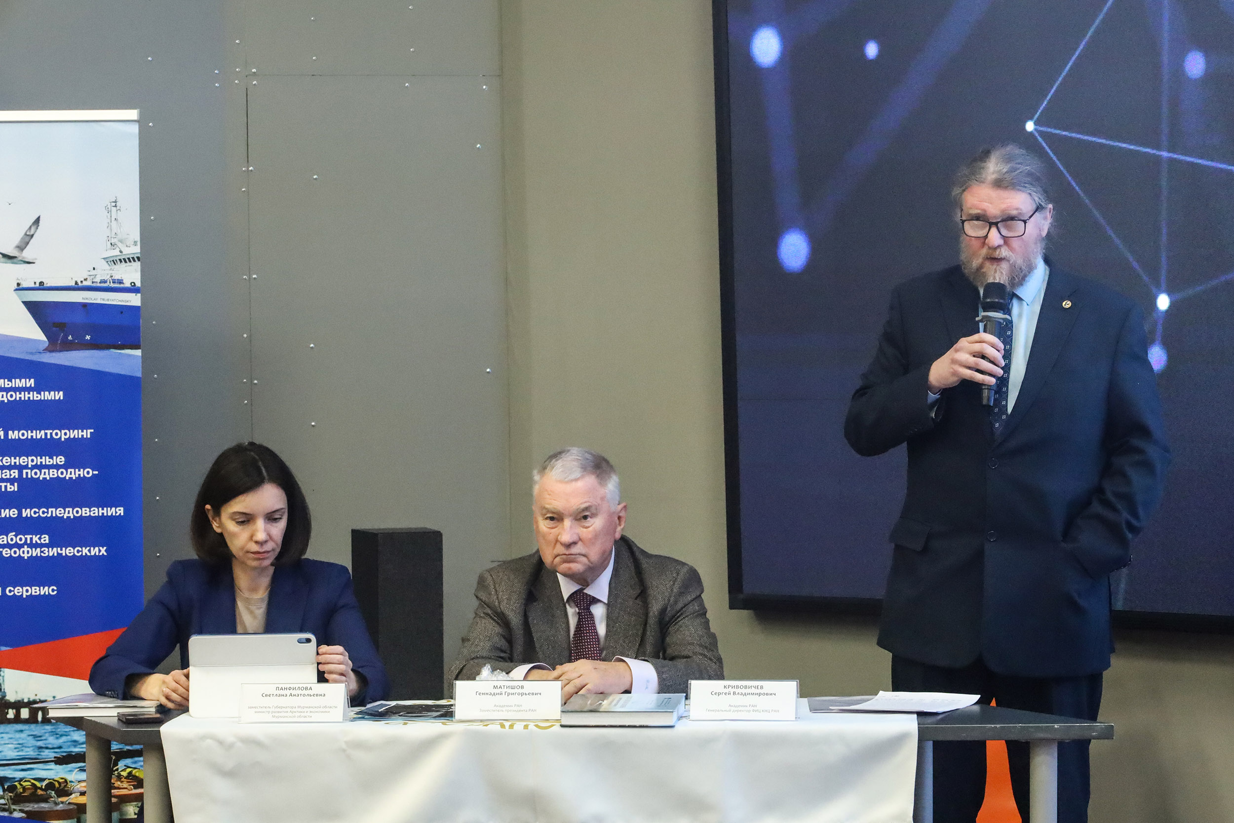 Научно-политический характер беседа приобрела во время специальной, совместной с Международной научно-практической конференцией «Безопасность арктических рубежей: экология, история, образы будущего», сессии «Шпицберген – территория международного сотрудничества и исследований в Арктике», в которой приняли участие Геннадий Матишов, Сергей Кривовичев, директор Первого Европейского департамента МИД РФ Артем Студенников, заместитель генерального директора Мурманской арктической геологоразведочной экспедиции Федор Жилин и представители правительства Мурманской области, Минобрнауки, Министерства иностранных дел, Совета Федерации, треста «Арктикуголь» и генерального консульства КНЦ в Санкт-Петербурге. Участники сессии акцентировали внимание на том, что сохранить научное присутствие на архипелаге для России важно и со стратегической точки зрения. Так, Сергей Кривовичев отметил большие ограничения российских исследований на этой территории, и подчеркнул необходимость их поддержки со стороны государства. Обсуждение безопасности арктических рубежей продолжится 30 и 31 октября – эту встречу также организует Мурманский морской биологический институт и Мурманское областное отделение Русского географического общества, а ученые Кольского научного центра РАН примут в ней живое участие.
