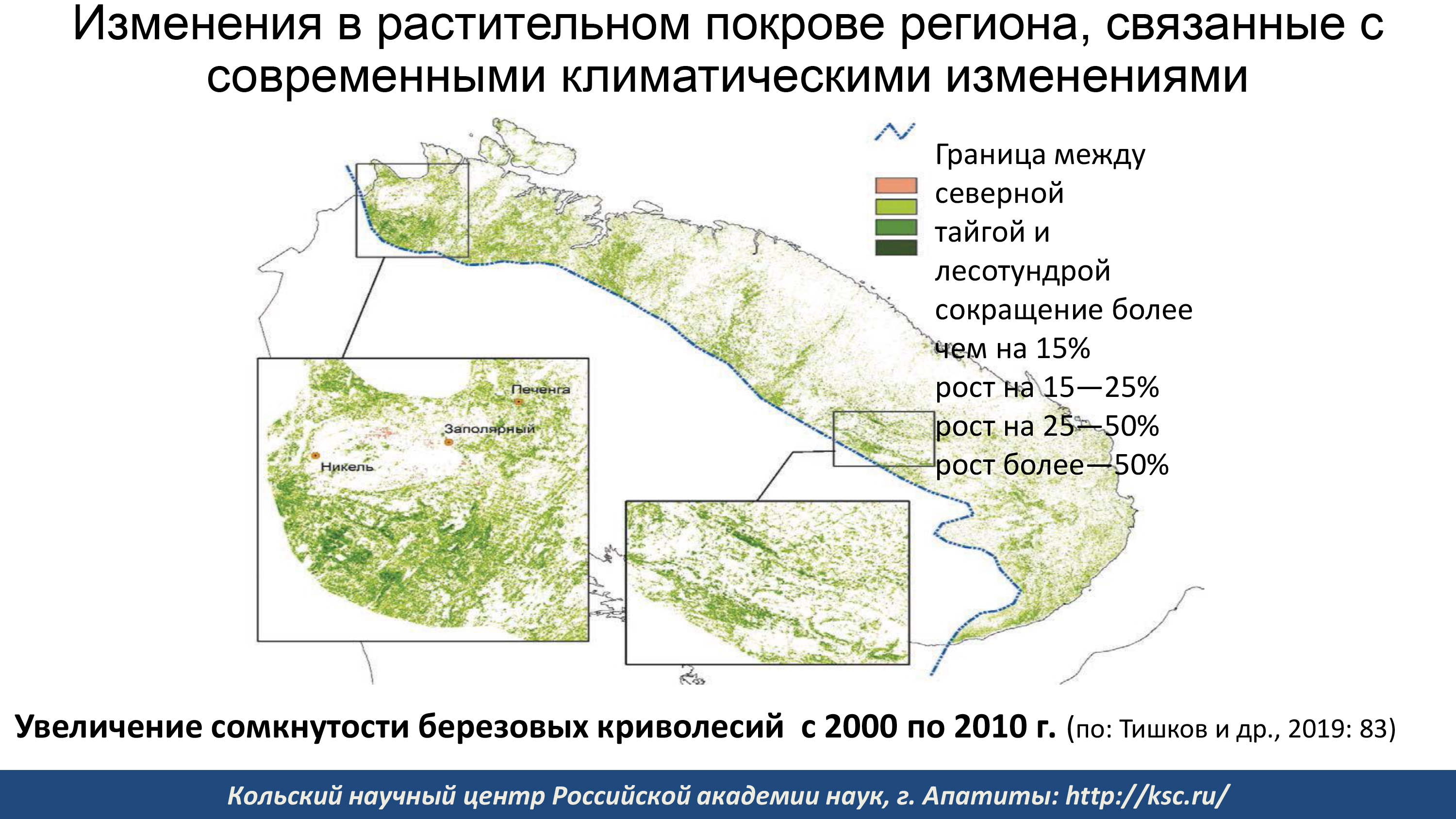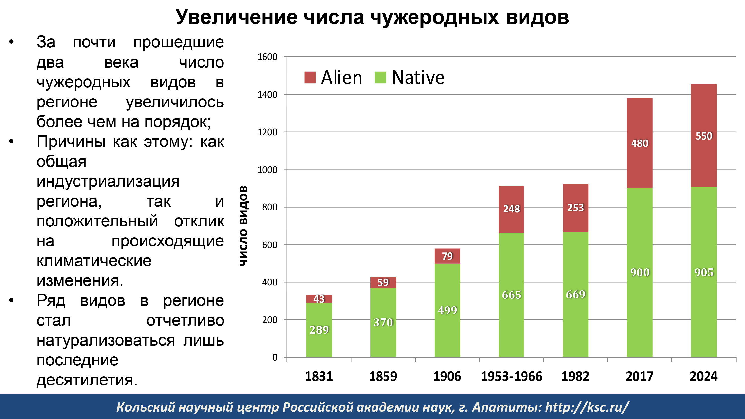 Но угрожает состоянию экосистем не только горная промышленность. Изменение климата, появление новых видов растений и строительство новых объектов на территории Мурманской области приводят к снижению качества и уничтожению местообитаний ресурсных и охраняемых видов растений, животных и грибов, утрате биоразнообразия, формированию новых растительных сообществ и сокращению ресурсного потенциала экосистем арктической зоны. В связи с потеплением поднялась граница лесов в горах и соответственно сократилась площадь горных тундр. Из-за наступления лесов «съежились» и северные тундры. Вблизи городов упрощается структура растительных сообществ, поскольку естественные местообитания уничтожаются, появляются нехарактерные для местности субстраты, чуждые природным экосистемам виды. До неузнаваемости меняется состав флоры и фауны на вырубках и гарях. И на все эти нарушенные местообитания наступают виды-«захватчики».