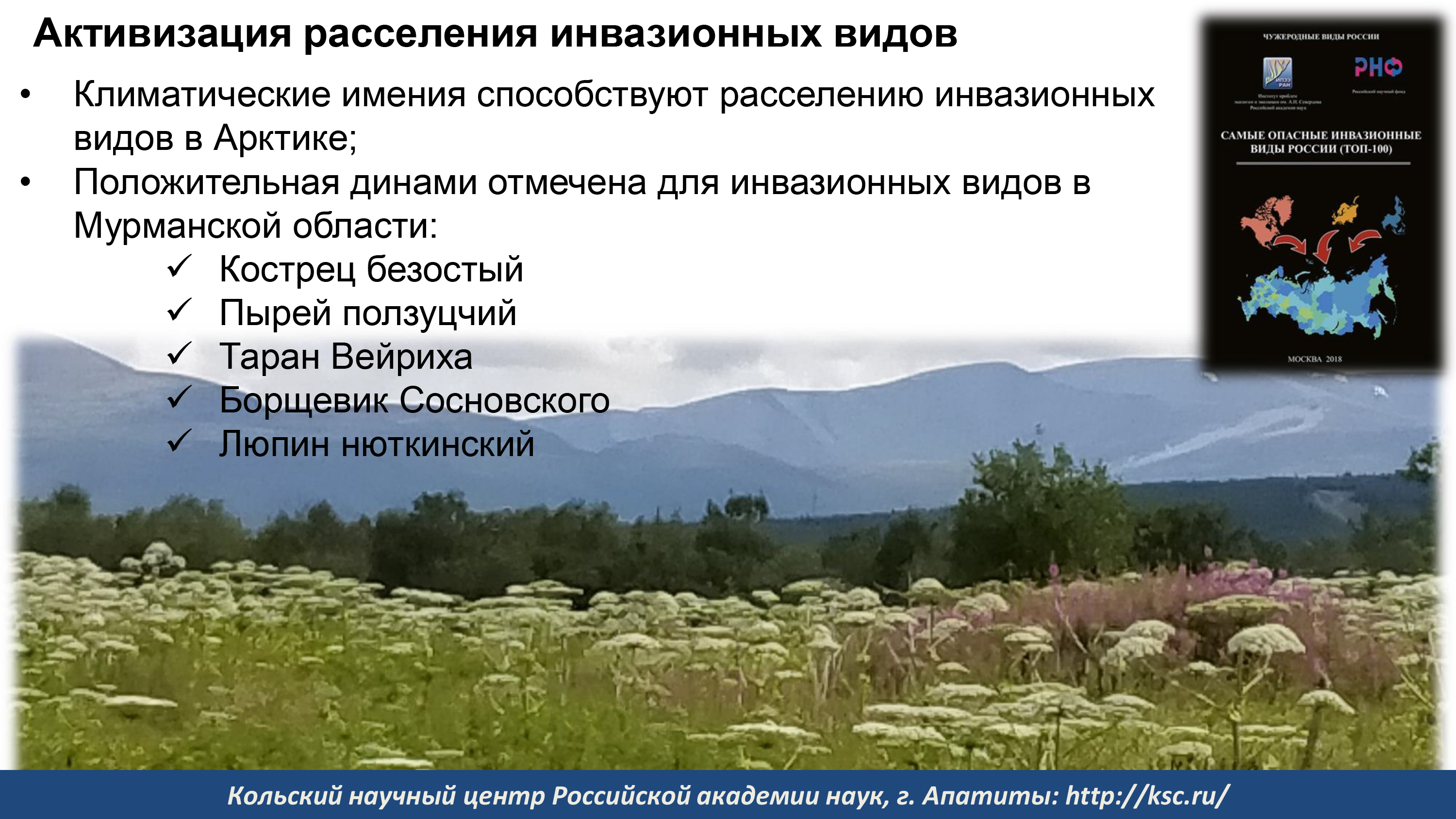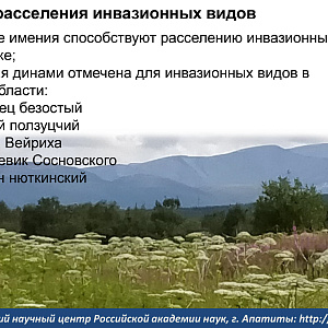 – По данным главного знатока адвентивных и инвазивных видов Мурманской области Михаила Кожина с 1831 года число чужеродных видов в регионе увеличилось более чем в десять раз – рассказал Евгений Боровичев. Пять из них – кострец безостый, пырей ползучий, таран Вейриха, борщевик Cосновского и люпин нюткинский – являются инвазионными. Они способны изменять «под себя» места, где приживаются, а некоторые, например, борщевик Сосновского, и непосредственно вредят человеку и животным, провоцируя в солнечное время тяжелые ожоги. Таран Вейриха может сравниться с борщевиком в умении захватывать новые территории, но, по счастью, не токсичен.