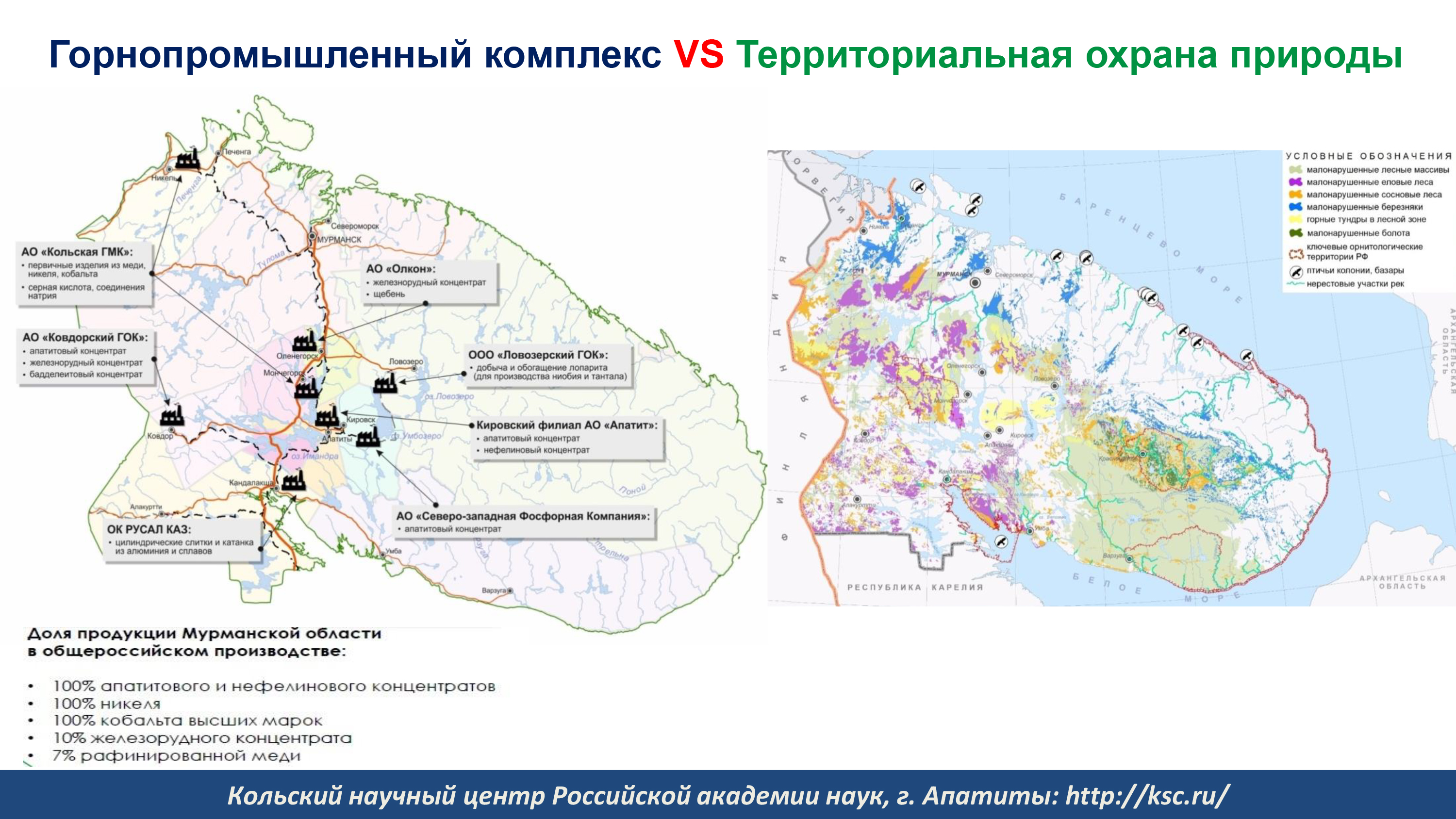 Кольский научный центр РАН обладает достаточными знаниями и опытом в создании мониторинговых систем. Так, уже 25 лет в Полярнозоринском районе специалисты Института проблем промышленной экологии Севера проводят комплексную оценку современного состояния наземных и водных экосистем в районе деятельности Кольской АЭС и на территориях вне зоны интенсивного промышленного воздействия. Кроме существующих предприятий, необходимо оценивать состояние окружающей среды и прогнозировать воздействие на нее в зонах, где новые предприятия только появятся в будущем. Такую работу – от оценки состояния до разработки рекомендаций по восстановлению природного баланса – ученые Кольского научного центра провели для платино-палладиевого месторождения Федорова тундра и Колмозерского месторождения лития.