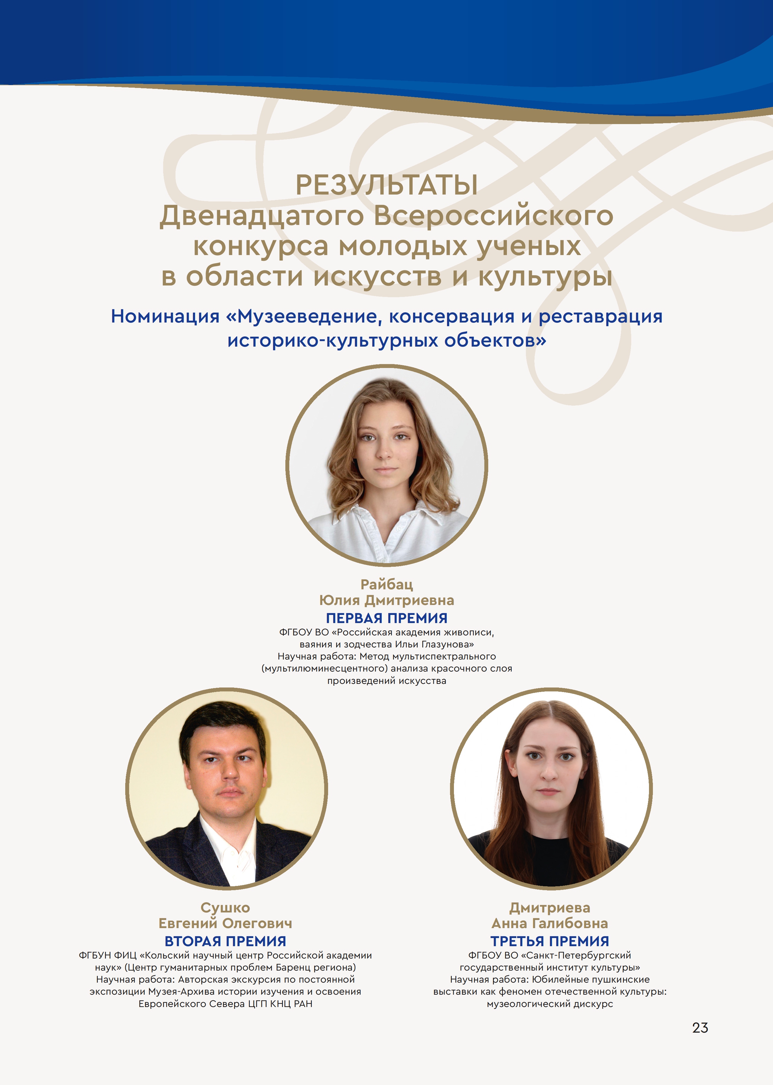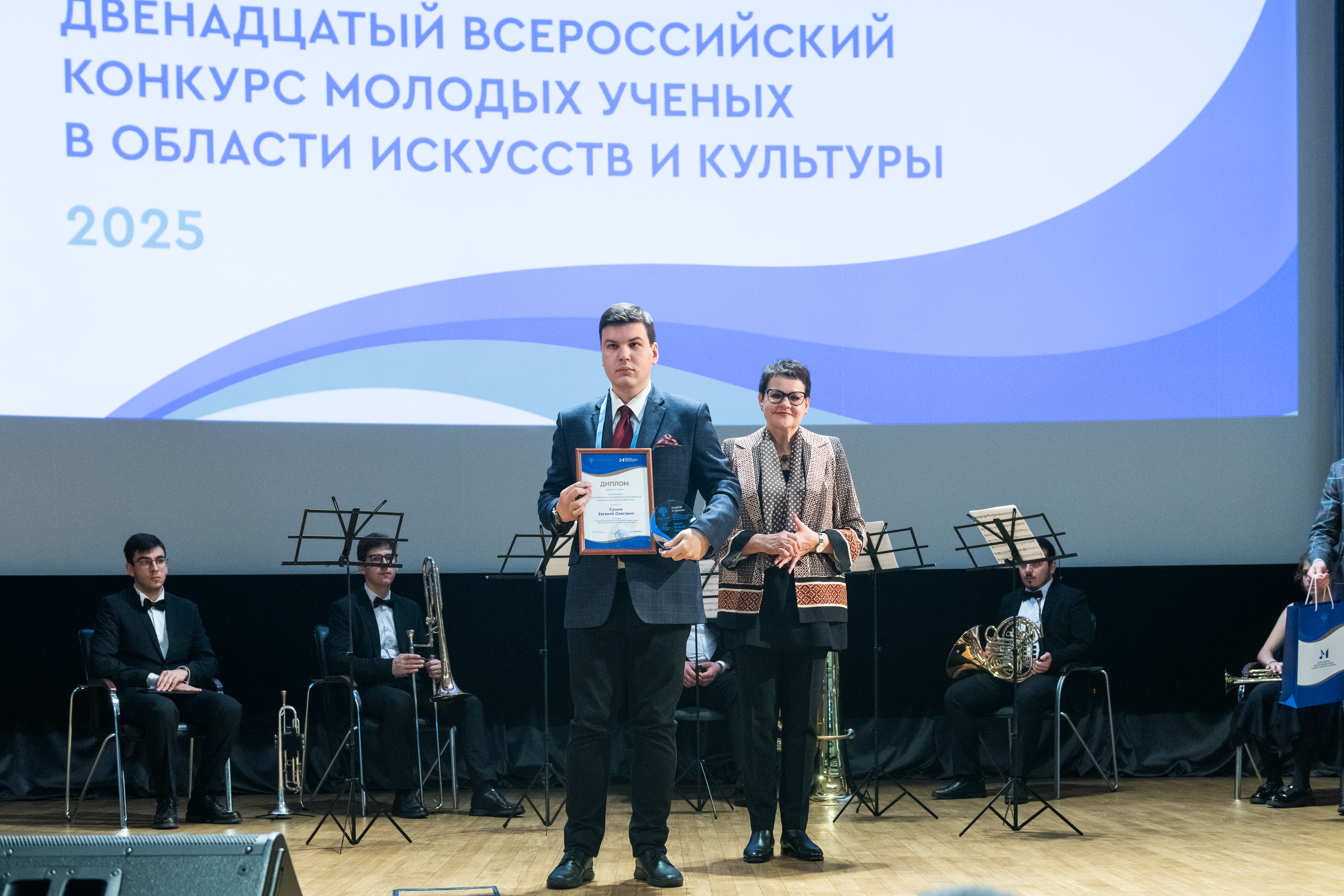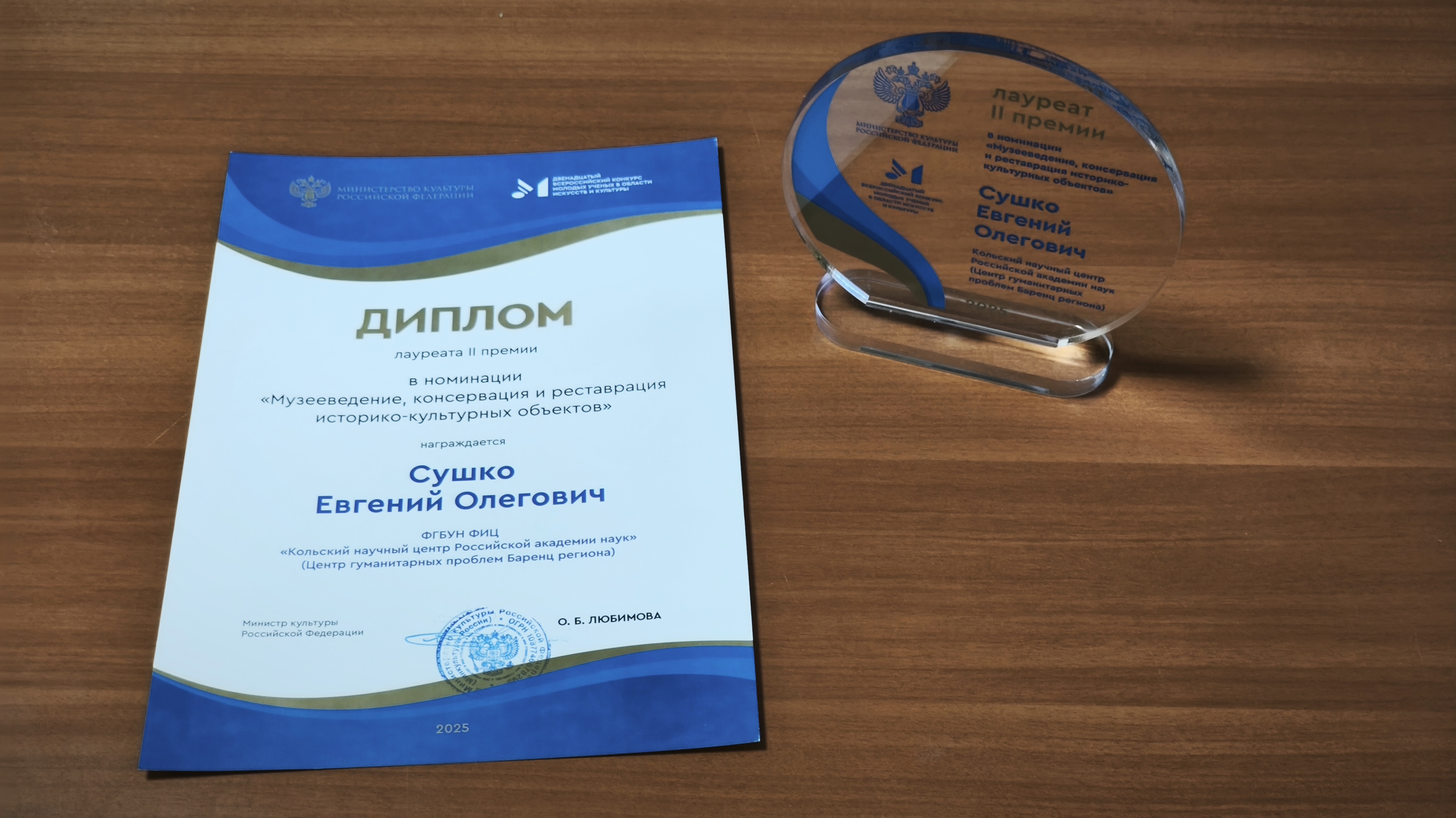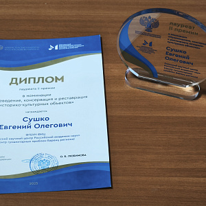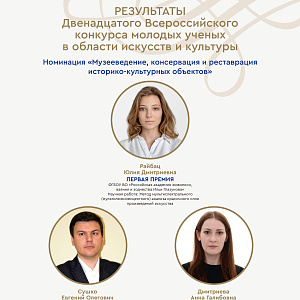 Министерство культуры Российской Федерации при поддержке Российского исследовательского института культурного и природного наследия имени Д.С. Лихачева и Российской академии музыки имени Гнесиных подвело итоги Двенадцатого Всероссийского конкурса молодых ученых в области искусств и культуры, в котором участвовали студенты, аспиранты и молодые ученые со всей России. Старший лаборант Сектора изучения и сохранения научного наследия ЦГП КНЦ РАН Евгений Сушко под руководством заведующей Сектором Ольги Шабалиной представил в номинации «Музееведение, консервация и реставрация историко-культурных объектов» авторскую экскурсию по постоянной экспозиции Музея-Архива истории изучения и освоения Европейского Севера ЦГП КНЦ РАН. В ней Евгений Олегович раскрыл авторский взгляд на экскурсию и ее основные особенности, связанные со спецификой репрезентации культурно-исторического и научного наследия в экспозиции Музея-Архива. По результатам второго тура конкурса молодой исследователь получил диплом лауреата II премии, памятный знак и денежный приз. Награду ему торжественно вручили 21 ноября в зале Министерства культуры Российской Федерации.